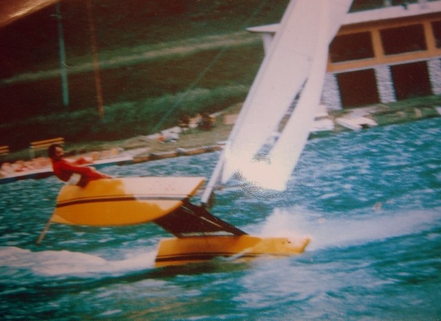 1973, varo sul lago di Auronzo di Cadore un winsurf, oggetto assolutamente sconosciuto a quel tempo, specie su un lago di montagna | ||